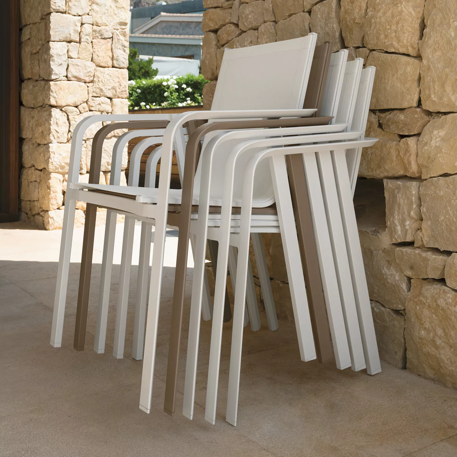 Das Gestell ist aus pulverbeschichtetem Aluminium, das in den Farben White, Dove und Graphite erhältlich ist. Die Bespannung des Stuhl kommt in der dazu passenden Farbe: