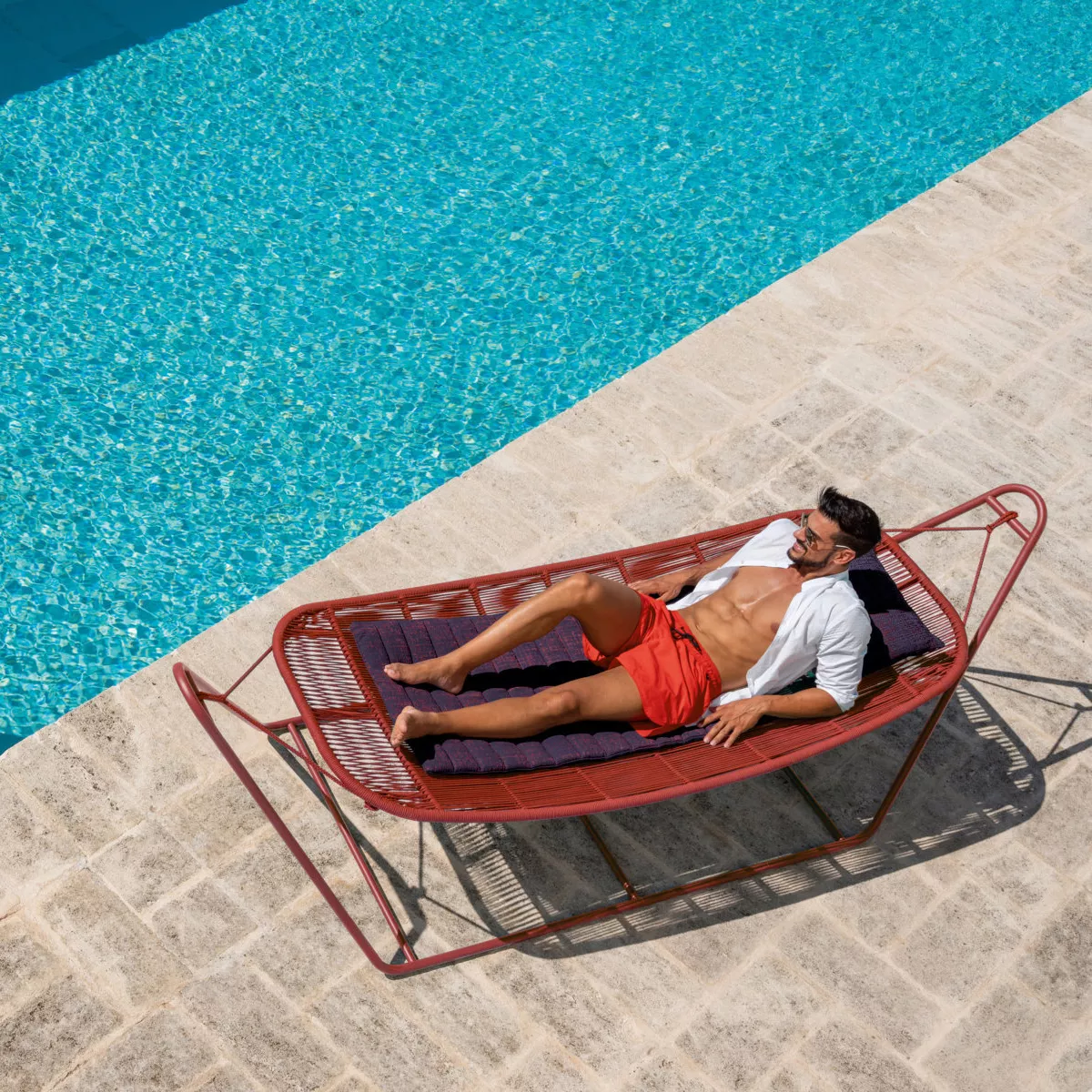 Das Gestell ist aus pulverbeschichtetem Aluminium, das in fünf verschiedenen Farben erhältlich ist. Die Bespannung der Sitz- und Rückenlehne aus synthetischem Seil kommt in der zum Gestell passenden Farbe. Die Polster und Kissen sind aus schnell trocknendem, komfortablen "Quick Dry" Schaumstoff gefertigt.