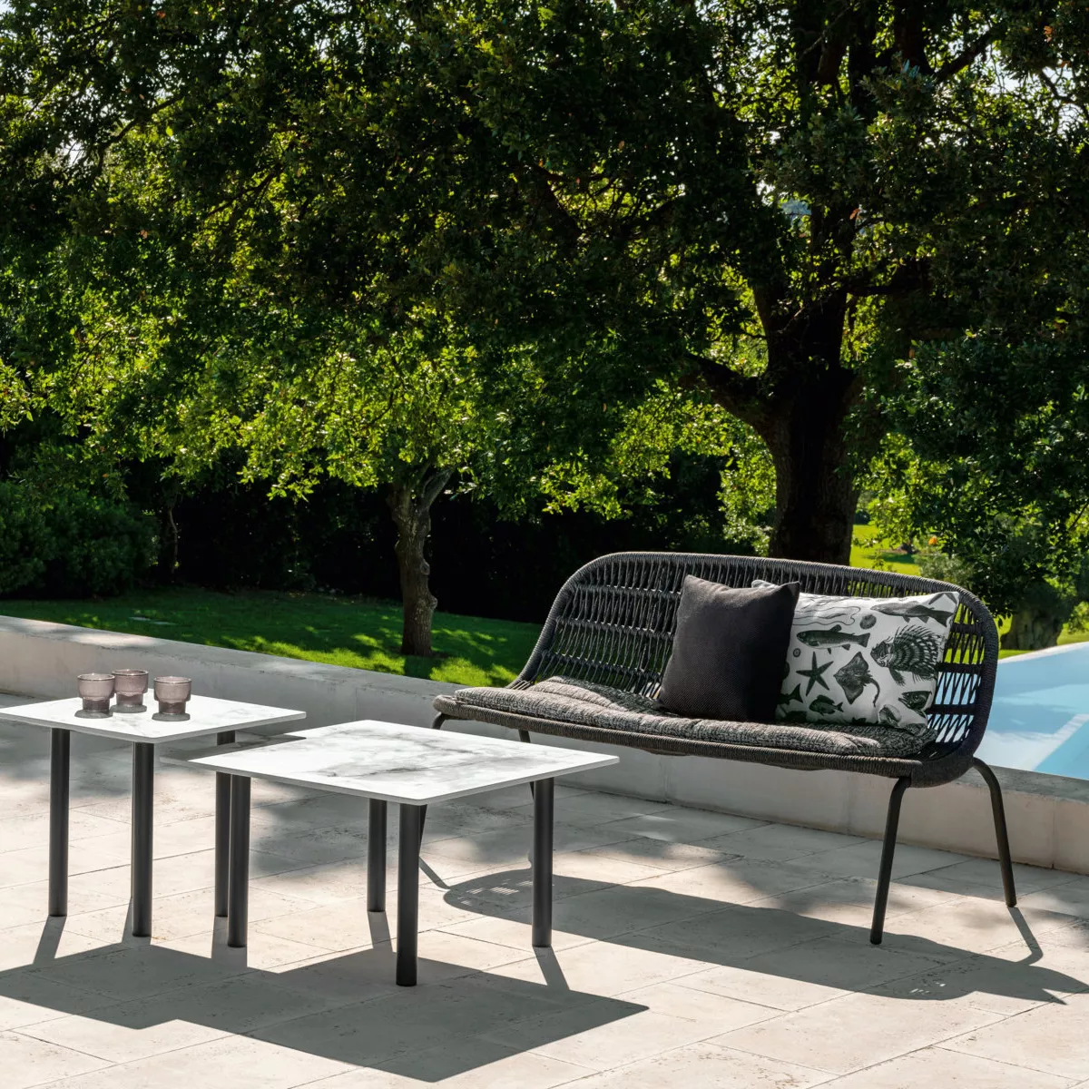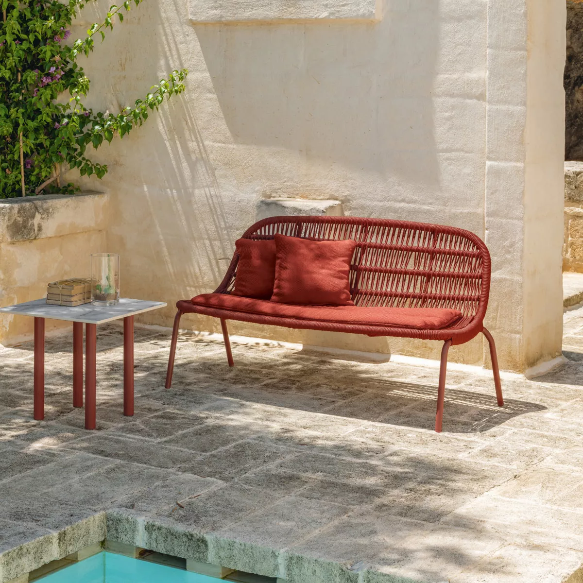 Das Gestell ist aus pulverbeschichtetem Aluminium, das in fünf verschiedenen Farben erhältlich ist. Die Bespannung der Sitz- und Rückenlehne aus synthetischem Seil kommt in der zum Gestell passenden Farbe. Die Polster und Kissen sind aus schnell trocknendem, komfortablen "Quick Dry" Schaumstoff gefertigt.