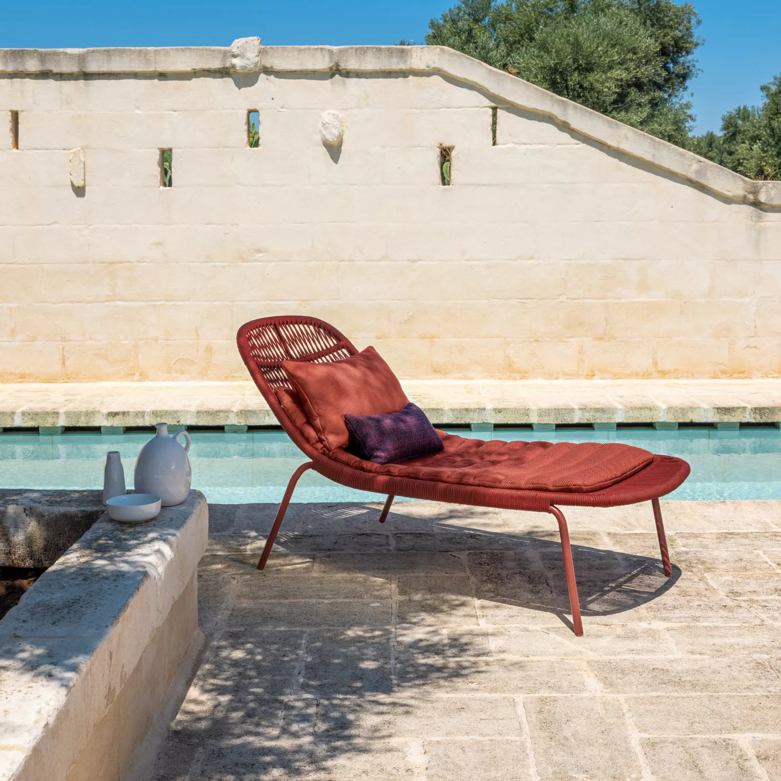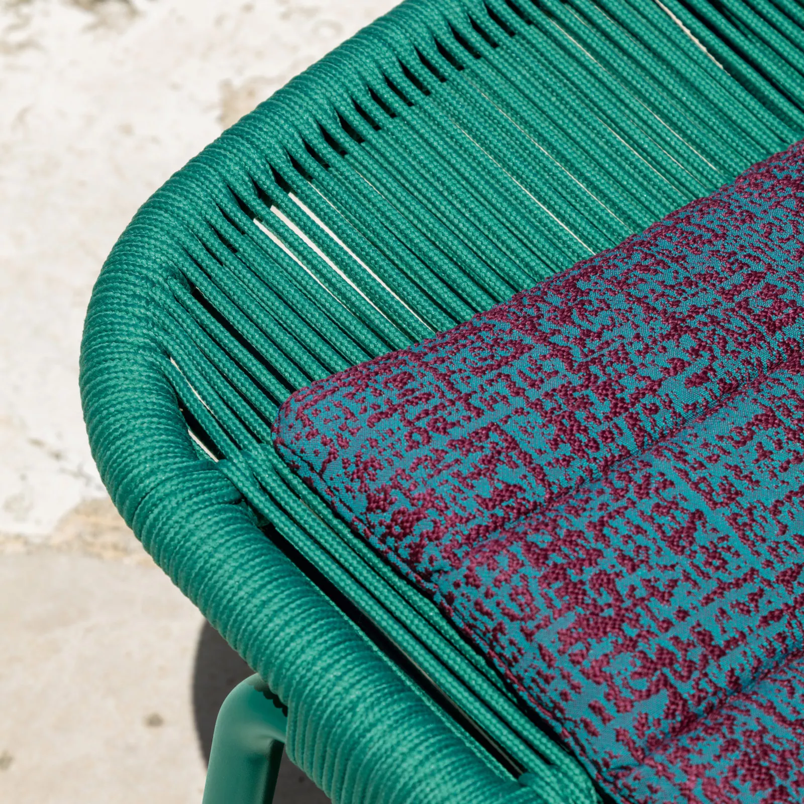 Das Gestell ist aus pulverbeschichtetem Aluminium, das in fünf verschiedenen Farben erhältlich ist. Die Bespannung der Sitz- und Rückenlehne aus synthetischem Seil kommt in der zum Gestell passenden Farbe. Die Polster und Kissen sind aus schnell trocknendem, komfortablen "Quick Dry" Schaumstoff gefertigt.