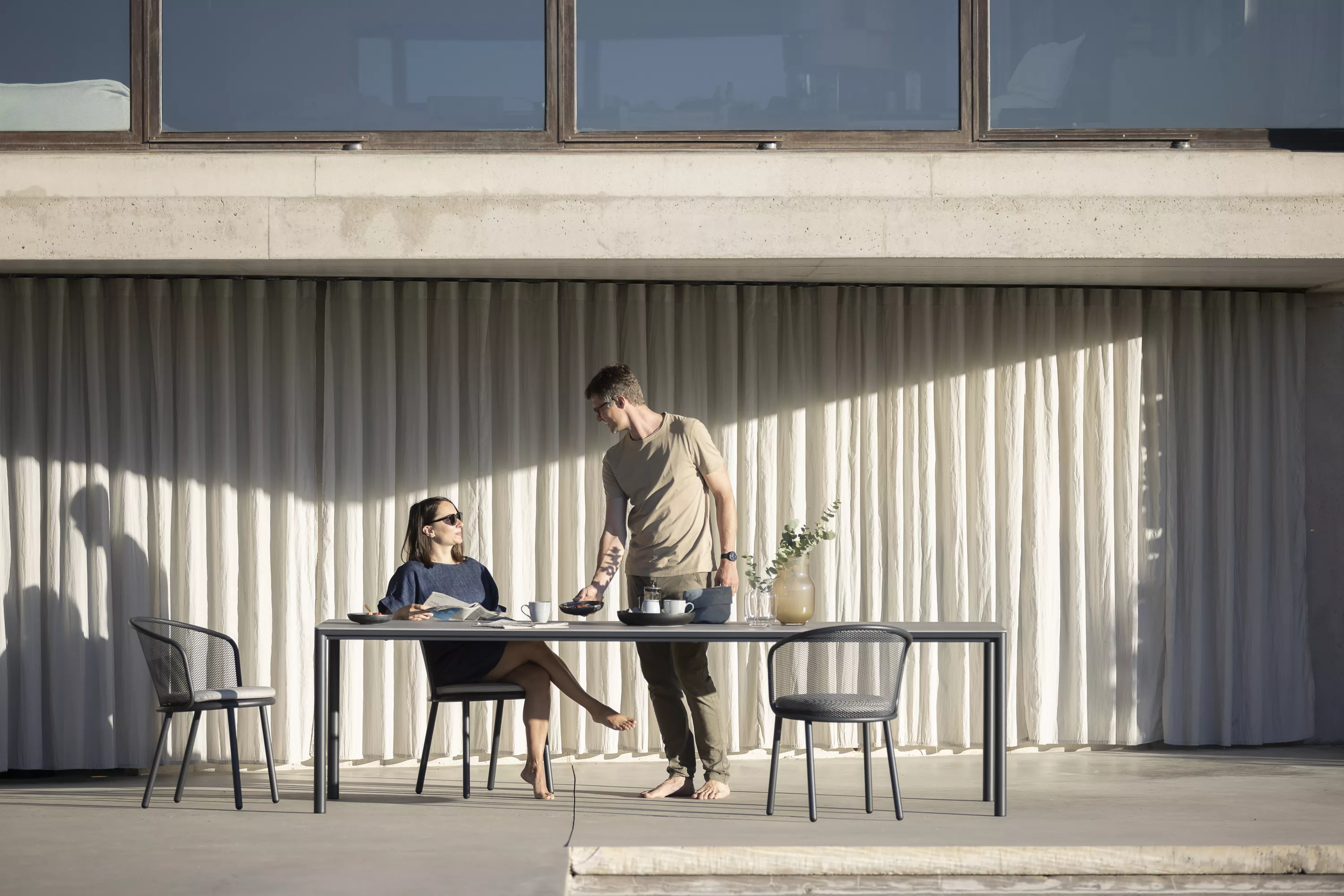 Der Tisch besteht aus einem pulverbeschichteten Edelstahlrahmen und einer Kermaik-Tischplatte.