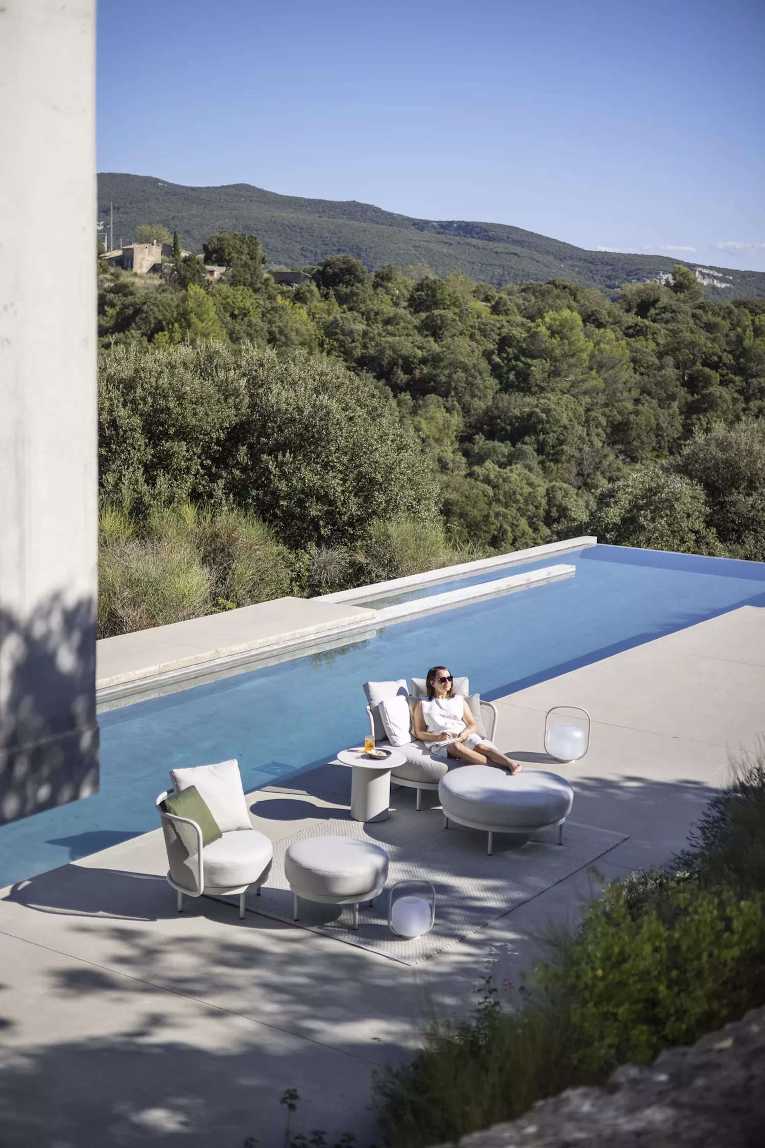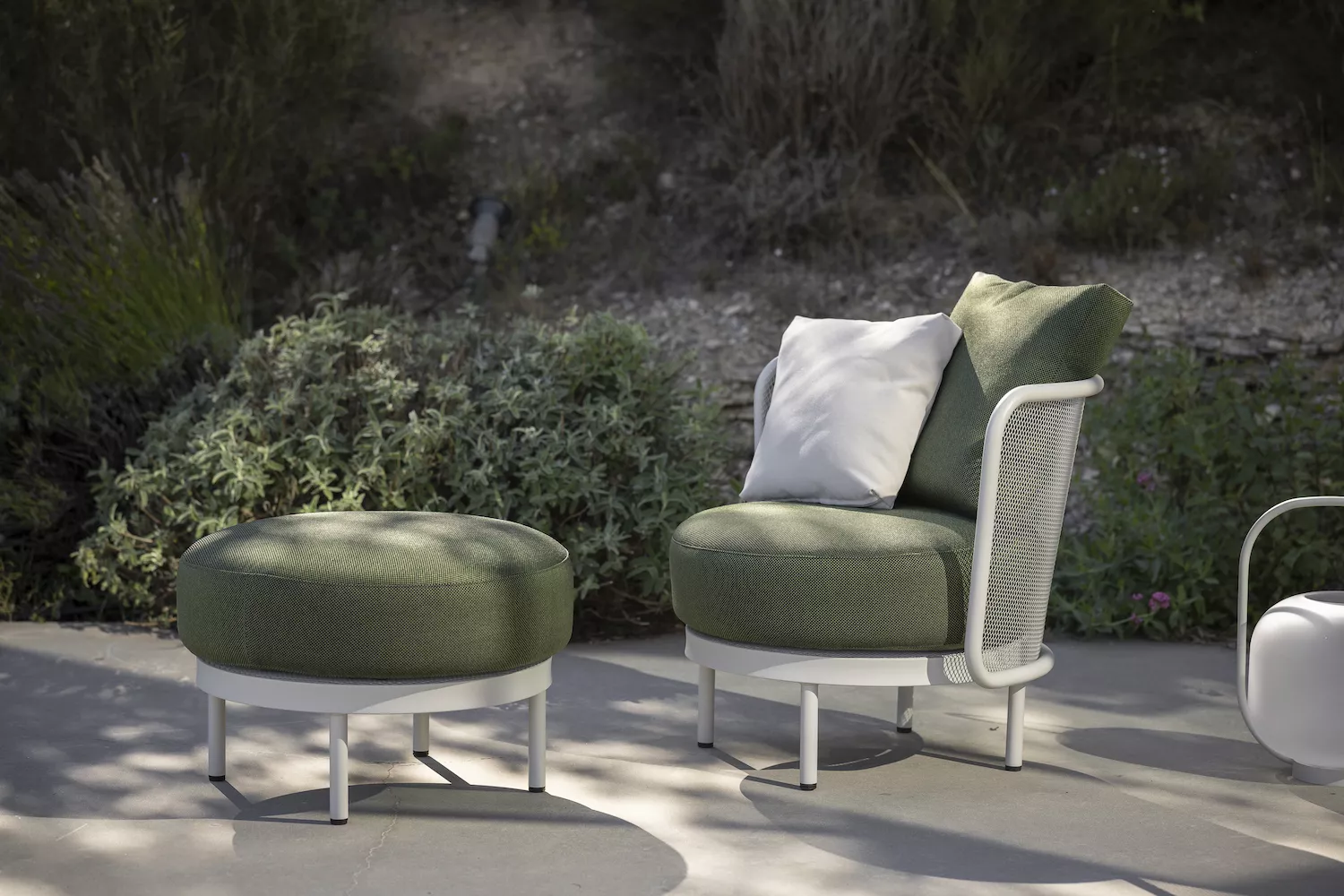 Crevin ist ein einzigartiger Bezugsstoff für den Außeneinsatz. 57%PP 38%PES 5%PU, 546gr/lm, Lichtechtheit: <6, 60.000 Marindale. Er hat ein natürliches Aussehen und kann leicht in der Waschmaschine gereinigt werden. Sofakissen sind mit Dryfeel® Allwetterschaum gefüllt.