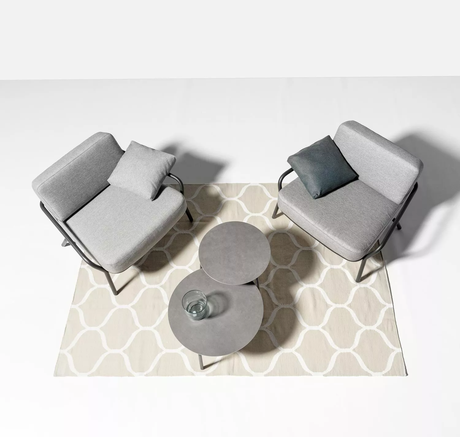 Crevin ist ein einzigartiger Bezugsstoff für den Außeneinsatz. Er hat ein natürliches Aussehen und kann leicht in der Waschmaschine gereinigt werden. Sofakissen sind mit Dryfeel® Allwetterschaum gefüllt.