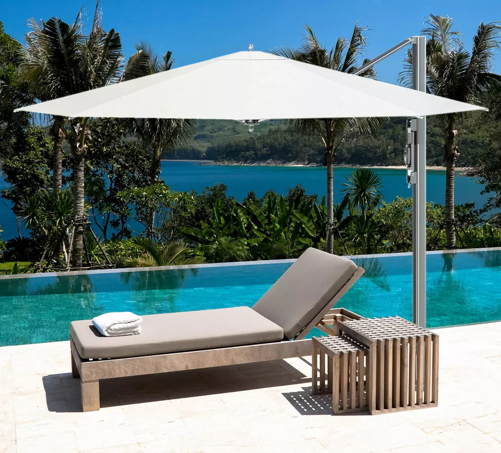 Mit seinem matten Finish nach Marinestandard, den Edelstahlverbindungen, Aluminiumstreben und dem exklusiven „Lift-Assist“-Beschattungssystem von TUUCI passt sich der Bay Master Pool Side, Swim-Under Cantilever jeder Außenumgebung an.