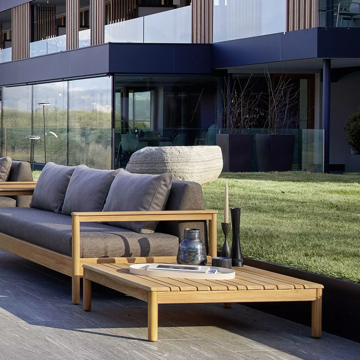Base mit Teakholzgestell. Bali Gartenmöbel Kollektion ist mit sichtbarem FSC Teakmassivholzrahmen (Teak aus zertifizierten Pflanzungen) und gepolsterten Elementen lieferbar. Das Sofa der BALI-Kollektion zeichnet sich durch eine leichte Holzstruktur mit klaren Linien aus, die mit weichen Kissen kombiniert ist und zur Ruhe einlädt sowie den essentiellen Komfort bietet, der fast Zen-artig ist. Das Bali Loungesofa und Loungesessel sind mit einem großen und bequemen Sitz ausgestattet. Die breite Palette der modernen und trendigen Stoffarben wird Ihre Auswahl bei der kreativen Gestaltung eines Außenbereich deutlich erleichtern. Diese Eigenschaften garantieren völlige Entspannung in jeder Umgebung im Freien. Die Varaschin Bali Lounge-Kollektion wird sicher zu einem Hingucker in Ihrem Garten, auf einer Terrasse oder Verande. Seit 1969 prägt Varaschin, ein venezianischer Marktführer aus der Outdoor Gartenmöbel Branche, die Bindung zwischen traditioneller Handwerkskunst und modernen ästhetischen Trends. Neben der Produktion von Outdoor-Kollektionen führt Varaschin Verträge aus, die von den angesehensten Namen in der italienischen und internationalen Design-Szene unterzeichnet werden. Jede Gartenmöbel Produktlinie hat ihre eigene Geschichte und Identität. Viel Liebe zum Detail, Originalität und Ästhetik sind die Kernmerkmale der Varaschin Kollektionen. In einem ausgeglichenen Spiel zwischen Leichtigkeit und Komfort entstehen einzigartige Gartenmöbel, die den Innenraum erweitern und mit der Natur verbinden.