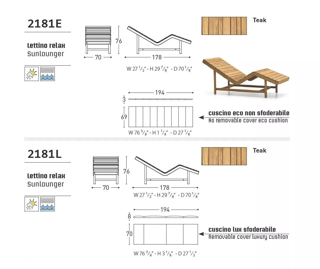 Liegestuhl 178 × 70 mit Teakholzgestell, rollbar. Barcode Gartenmöbel Kollektion ist mit sichtbarem FSC Teakmassivholzrahmen (Teak aus zertifizierten Pflanzungen) und gepolsterten Elementen lieferbar. Rücken- und Armlehnen Innenstruktur besteht aus Okumé Holz in der Outdoor Ausführung. Seit 1969 prägt Varaschin, ein venezianischer Marktführer aus der Outdoor Gartenmöbel Branche, die Bindung zwischen traditioneller Handwerkskunst und modernen ästhetischen Trends. Neben der Produktion von Outdoor-Kollektionen führt Varaschin Verträge aus, die von den angesehensten Namen in der italienischen und internationalen Design-Szene unterzeichnet werden. Jede Gartenmöbel Produktlinie hat ihre eigene Geschichte und Identität. Viel Liebe zum Detail, Originalität und Ästhetik sind die Kernmerkmale der Varaschin Kollektionen. In einem ausgeglichenen Spiel zwischen Leichtigkeit und Komfort entstehen einzigartige Gartenmöbel, die den Innenraum erweitern und mit der Natur verbinden.