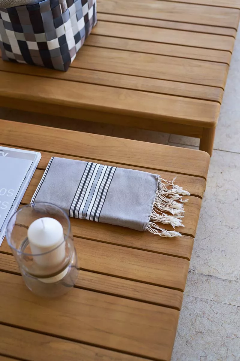 Das von Varaschin ausgewählte Teakholz ist ein hervorragendes Material hochwertiger Qualität, ideal für die Herstellung von Gartenmöbeln, da es auch bei Temperaturschwankungen, Wasser, Feuchtigkeit und Salz sehr gut haltbar ist. Da Teak von Natur aus sehr viel Öl enthält, ist das hochwertige Holz für Anwendungen im Außenbereich von allen Holzarten am besten geeignet. Teakholz ist ein tropisches Hartholz. Frisches Teakholz hat eine honigbraune Farbe. Wird unbehandeltes Teakholz Witterungseinflüssen ausgesetzt, nimmt die honigbraune Farbe allmählich eine silbergraue Patina an, die für gealtertes Teakholz typisch ist.