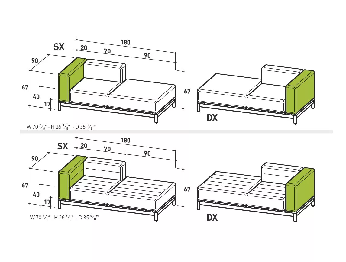 Varaschin Barcode Loungesessel Endmodul 180 cm mit Teakholzgestell und Ablagefläche Gartensessel Loungemodul 90 × 90 mit Teakholzgestell 180 cm und Ablagefläche. Barcode Gartenmöbel Kollektion ist mit sichtbarem FSC Teakmassivholzrahmen (Teak aus zertifizierten Pflanzungen) und gepolsterten Elementen sowie in der gesteppten Ausführung lieferbar. Rücken- und Armlehnen Innenstruktur besteht aus Okumé Holz in der Outdoor Ausführung. Seit 1969 prägt Varaschin, ein venezianischer Marktführer aus der Outdoor Gartenmöbel Branche, die Bindung zwischen traditioneller Handwerkskunst und modernen ästhetischen Trends. Neben der Produktion von Outdoor-Kollektionen führt Varaschin Verträge aus, die von den angesehensten Namen in der italienischen und internationalen Design-Szene unterzeichnet werden. Jede Gartenmöbel Produktlinie hat ihre eigene Geschichte und Identität. Viel Liebe zum Detail, Originalität und Ästhetik sind die Kernmerkmale der Varaschin Kollektionen. In einem ausgeglichenen Spiel zwischen Leichtigkeit und Komfort entstehen einzigartige Gartenmöbel, die den Innenraum erweitern und mit der Natur verbinden. Die Kombination des warmen Teakholz mit dem weichen, komfortablen Polster sorgt für ein Möbelstück mit Stil und Klasse. Varaschin verdient ein Platz mitten im Garten, wo die Schönheit von allen Seiten sichtbar wird! KissenVaraschin Möbel werden hergestellt aus den wetterfesten Materialien. Das gilt ebenso auch für die Kissen und Polster. Teak Das von Varaschin ausgewählte Teakholz ist ein hervorragendes Material hochwertiger Qualität, ideal für die Herstellung von Gartenmöbeln, da es auch bei Temperaturschwankungen, Wasser, Feuchtigkeit und Salz sehr gut haltbar ist. Da Teak von Natur aus sehr viel Öl enthält, ist das hochwertige Holz für Anwendungen im Außenbereich von allen Holzarten am besten geeignet. Teakholz ist ein tropisches Hartholz. Frisches Teakholz hat eine honigbraune Farbe. Wird unbehandeltes Teakholz Witterungseinflüssen ausgesetzt, nimmt die honigbraune Farbe allmählich eine silbergraue Patina an, die für gealtertes Teakholz typisch ist. Produkteigenschaften Teakholzgestell die Herstellung dieser hochwertigen Möbel erfolgt in erstklassiger Qualität UV-, witterungs- und farbbeständig wetterfeste Kissen und Polster leicht zu reinigen Maße: (B × T × H) 180 × 90 × 67 cm Outdoor EinsatzDie Kollektion ist beständig gegen Sonnenlicht und Regen. Die Möbel sollten regelmäßig instandgehalten und im Falle von besonders schlechten Witterungsbedingungen (Eis, Hagel, Temperaturschwankungen, anhaltende Feuchtigkeit, extreme Hitze oder Kälte) geschützt werden. Die Lebensdauer und Haltbarkeit unserer Artikel hängt von der sorgfältigen Pflege ab. Bei Aluminium- und Stahlprodukten (430 , 304EP , 316), auch wenn durch Oberflächenbehandlung für die Aufstellung im Freien geeignet, ist es grundlegend wichtig, in den Produkten aufgestautes Wasser zu entfernen. Alle Artikel sind mit den erforderlichen technischen Bohrungen für Schutzbehandlungen versehen. Der Eintritt von Wasser und dessen Stauung kann zu Rostbildungen in den Rohren führen. Das Produkt ist für den Gebrauch im Meeresklima und zur Aufstellung an chlorhaltigen Swimmingpools geeignet. Empfehlungen: ordnungsgemäße Instandhaltung und Reinigung sind grundlegend wichtig, um die Integrität der Komponenten so lange wie möglich zu erhalten. Um die Produkte immer in gutem Zustand zu erhalten, sollten sie wöchentlich mit reichlich salzfreiem Wasser gewaschen werden, um das Salz, das die Produkte angreift, so gut wie möglich zu beseitigen. Nur auf diese Weise kann das Produkt mit Sicherheit in gutem Zustand gehalten werden.