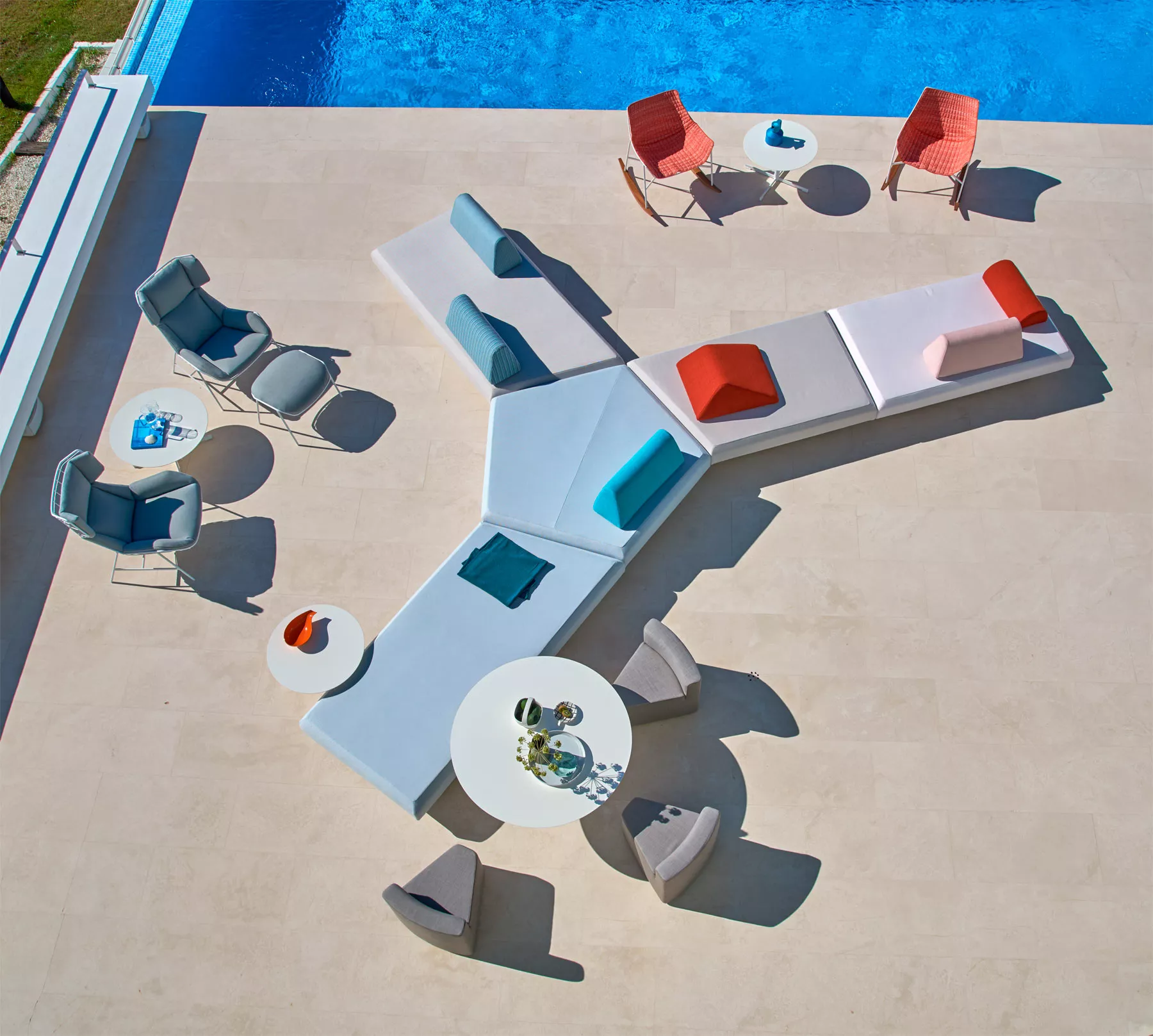 Es handelt sich um ein System von modularen Sofas, bei dem rechteckige, trapezförmige und fünfeckige Sockel frei kombiniert werden können, wodurch eine große Vielfalt an Kompositionen entsteht.