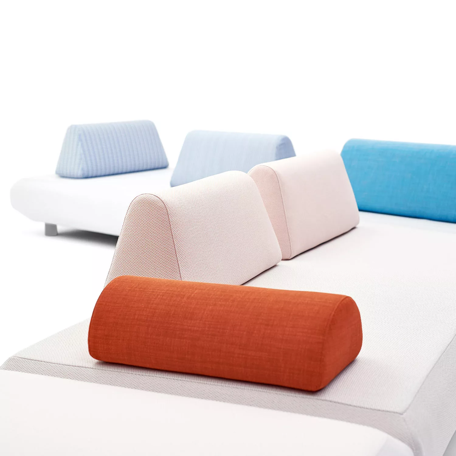 Es handelt sich um ein System von modularen Sofas, bei dem rechteckige, trapezförmige und fünfeckige Sockel frei kombiniert werden können, wodurch eine große Vielfalt an Kompositionen entsteht.