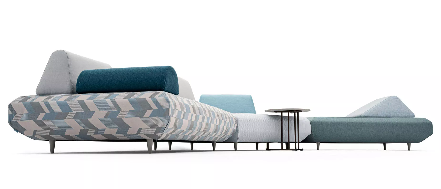 Es handelt sich um ein System von modularen Sofas, bei dem rechteckige, trapezförmige und fünfeckige Sockel frei kombiniert werden können, wodurch eine große Vielfalt an Kompositionen entsteht.
