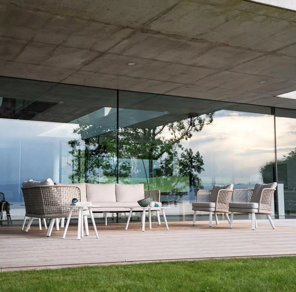 Die Outdoorkollektion Varaschin Emma Lounge mit pulverbeschichtetem Aluminiumgestell oder Iroko-Beinen bietet zahlreiche Kombinationen aus verschiedenen Materialien und Stoffen. Die Rückenlehne des Emma Loungesofas besteht aus handgewebtem Kunstfaserkordel. Es ist ein sehr praktischer und robuster Gartensofa, ideal für die Einrichtung von Hotelterrassen oder Gärten. Emma Outdoor Sofa ist ein schicker und moderner Möbelstück, das mit vielen anderen Outdoor-Möbeln vielseitig kombiniert werden kann, um das perfekte Outdooroutfit für Gärten oder Veranden zu schaffen. Vom Shabby-Chic bis zum Industrial, vom romantischen bis zum modernen Stil: Ein Loungesofa, das in fast jede Umgebung und zu jeder Stimmung passt. Seit 1969 prägt Varaschin, ein venezianischer Marktführer aus der Outdoor Gartenmöbel Branche, die Bindung zwischen traditioneller Handwerkskunst und modernen ästhetischen Trends. Neben der Produktion von Outdoor-Kollektionen führt Varaschin Verträge aus, die von den angesehensten Namen in der italienischen und internationalen Design-Szene unterzeichnet werden. Jede Gartenmöbel Produktlinie hat ihre eigene Geschichte und Identität. Viel Liebe zum Detail, Originalität und Ästhetik sind die Kernmerkmale der Varaschin Kollektionen. In einem ausgeglichenen Spiel zwischen Leichtigkeit und Komfort entstehen einzigartige Gartenmöbel, die den Innenraum erweitern und mit der Natur verbinden.