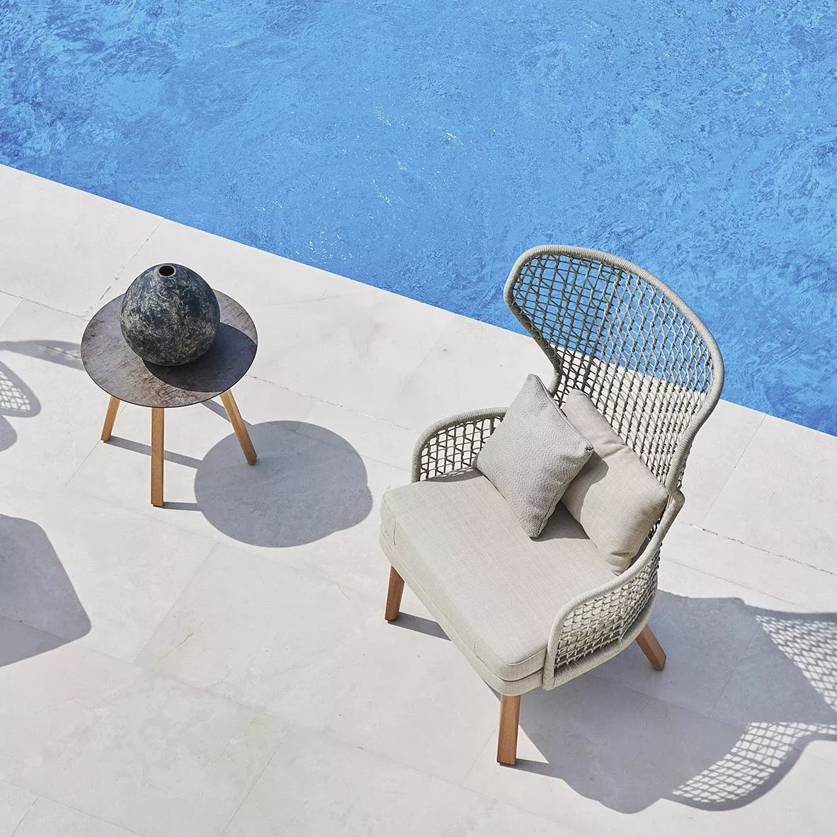 Varaschin Emma Cross Couchtisch Ø 49 cm Die Emma Cross Couchtische ergänzen die Kollektion mit stilvollen, niedrigen Tischen, die perfekt für den Außenbereich geeignet sind. Ihre Konstruktion aus pulverbeschichtetem Aluminium macht sie leicht und gleichzeitig stabil. Die Tischbeine sind mit einer handgeflochtenen Kunstfaser-Kordel umwoben und verleihen den Tischen eine besondere handwerkliche Note. Produkteigenschaften Aluminium-Untergestell die Herstellung dieser hochwertigen Möbel erfolgt in erstklassiger Qualität UV-, witterungs- und farbbeständig Tischplatte in HPL oder Keramikausführung leicht zu reinigen Maße: (B × H)Ø 49 x 46 cm Outdoor EinsatzDie Kollektion ist beständig gegen Sonnenlicht und Regen. Die Möbel sollten regelmäßig instandgehalten und im Falle von besonders schlechten Witterungsbedingungen (Eis, Hagel, Temperaturschwankungen, anhaltende Feuchtigkeit, extreme Hitze oder Kälte) geschützt werden. Die Lebensdauer und Haltbarkeit unserer Artikel hängt von der sorgfältigen Pflege ab. Auch wenn durch Oberflächenbehandlung für die Aufstellung im Freien geeignet, ist es grundlegend wichtig, in den Produkten aufgestautes Wasser zu entfernen. Alle Artikel sind mit den erforderlichen technischen Bohrungen für Schutzbehandlungen versehen. Das Produkt ist für den Gebrauch im Meeresklima und zur Aufstellung an chlorhaltigen Swimmingpools geeignet. Empfehlungen: ordnungsgemäße Instandhaltung und Reinigung sind grundlegend wichtig, um die Integrität der Komponenten so lange wie möglich zu erhalten. Um die Produkte immer in gutem Zustand zu erhalten, sollten sie wöchentlich mit reichlich salzfreiem Wasser gewaschen werden, um das Salz, das die Produkte angreift, so gut wie möglich zu beseitigen. Nur auf diese Weise kann das Produkt mit Sicherheit in gutem Zustand gehalten werden.