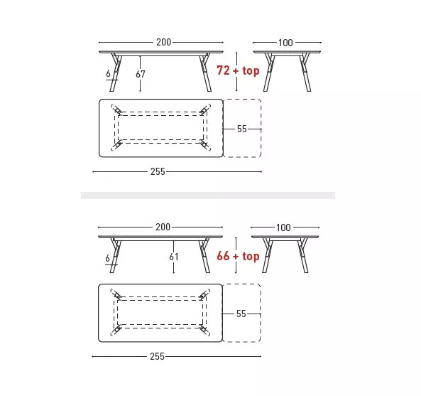 200/255 × 100 × 66/72 cm + Tischplattenhöhe