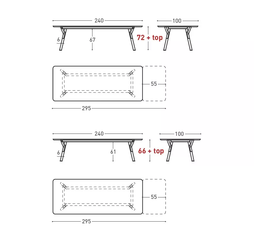 240/295 × 100 × 66/72 cm + Tischplattenhöhe
