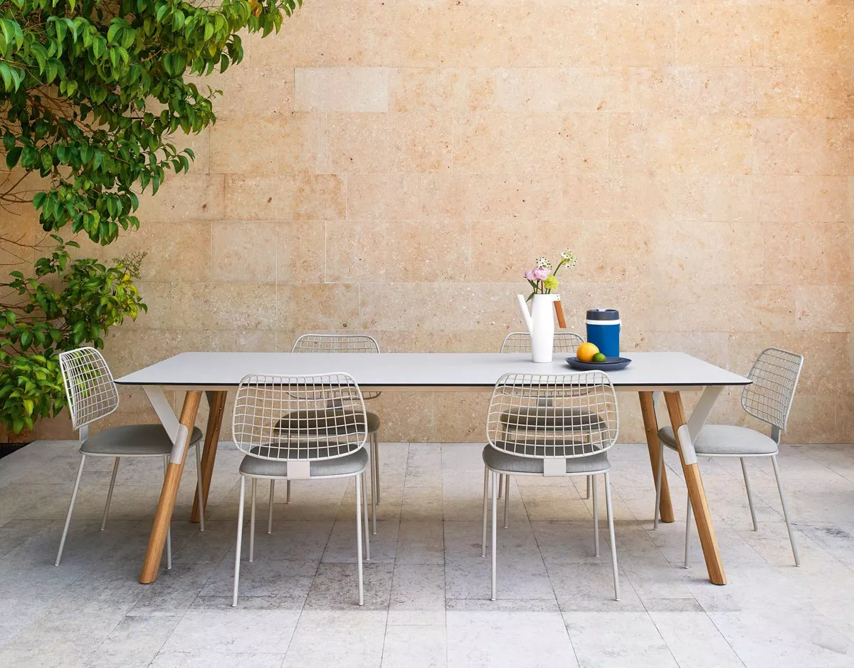 Die Outdoorkollektion Varaschin Link, bestehend aus festen oder ausziehbaren Tischen mit einem rostfreien Stahlgestell, (Rahmen + Bügel + Beine) pulverbeschichtet. Beine sind auch in Teak massiv, FSC zertifiziert lieferbar. Sehr robust und widerstandsfähig sind diese Outdoor Esstische für jeden Gebrauch im Freien geeignet, von der Verwendung im Garten, bis auf der Terrasse eines Restaurants oder eines Strandhauses. HPL-, Teak- oder Zementtischplatten (nur feste Tische 200 × 100 und 240 × 100) werden auf einem Gestell in der Standardhöhe 72 cm oder in der Ausführung Low 66 cm montiert.