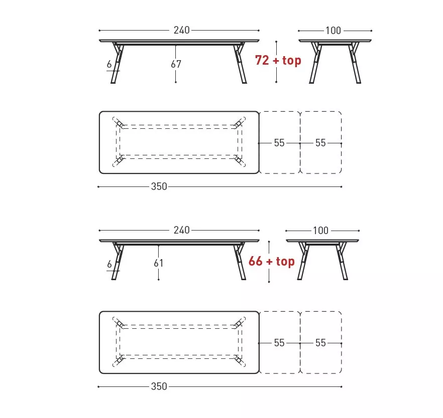 240/295/350 × 100 × 66/72 cm + Tischplattenhöhe