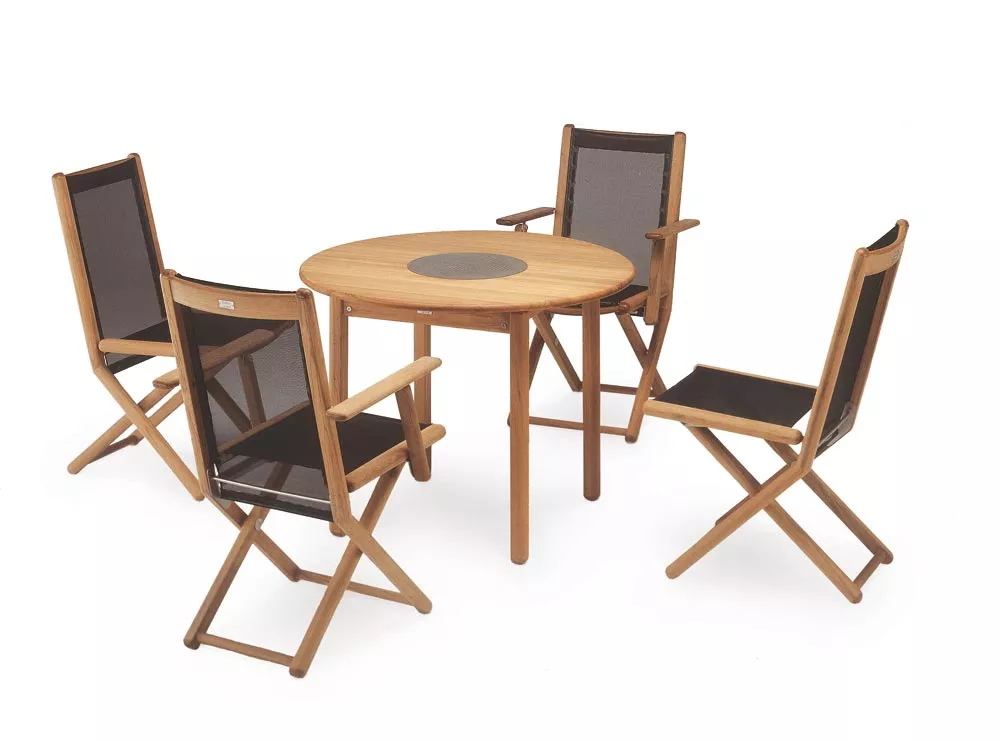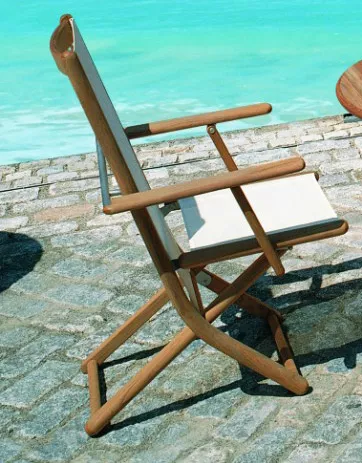 Verstellsessel Tennis von Fischer Möbel aus Teakholz mit Edelstahlbeschlägen und Batyline® Gewebe.