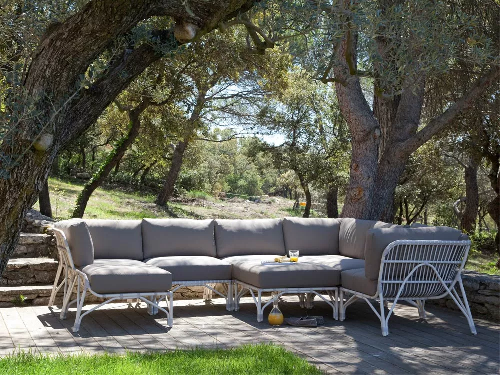 Lucy verleiht Ihrer Terrasse und Ihrem Garten Charme und Komfort. Die weichen, fließenden Rundungen dieser Loungesessel laden dazu ein, sich in der Sonne zu entspannen. Diese Kollektion taucht in die Siebziger ein, kombiniert aber auch das gleiche Retro-Design mit dem heutigen Komfort. Der hervorragende Sitzkomfort wird durch die handwerkliche Kunstfertigkeit dieses Harzgeflechts erreicht. Der Rahmen besteht aus pulverbeschichtetem Aluminium. Lucy kann das ganze Jahr über im Freien bleiben. Die Kollektion umfasst eine Chaiselongue, mehrere Loungesessel, einen Fußhocker und einen Beistelltisch.