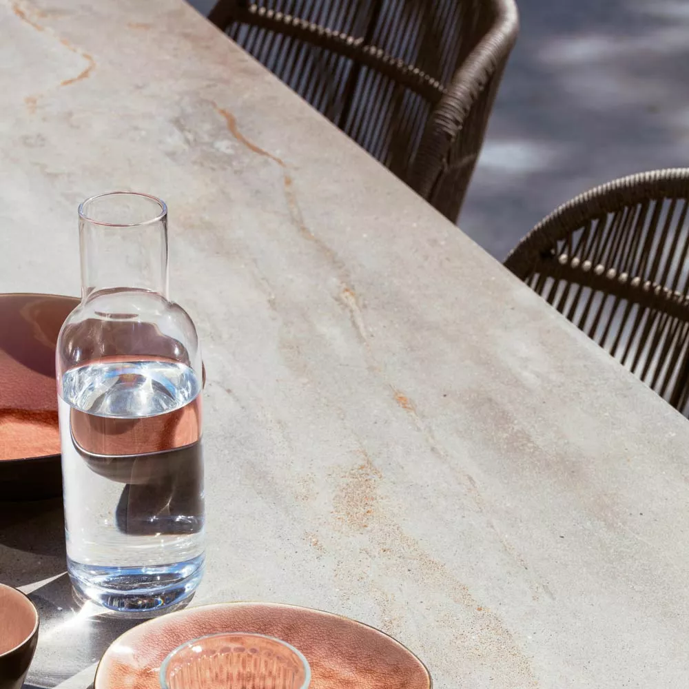Vincent Sheppard Kodo Outdoor Gartentisch | 210 × 100 cm Inspiriert von den vielseitigen Möglichkeiten, verschiedene Materialien in einzigartige Designs zu mischen, kreierten Studio Segers die Kodo-Kollektion. Naturkeramik, industrielles Aluminium und taktiles Acrylseil finden Verwendung in der gesamten Kollektion. Diese Materialien sind wetterbeständig und verleihen den Möbeln ein zeitgemäßes Gefühl, während die weichen Kurven und abgerundeten Rücken ein warmes und einladendes Ambiente ausstrahlen. Suchen Sie sich einen ruhigen Ort aus und entspannen Sie sich auf der bequemen Möbeln. Berühren, fühlen und erleben Sie das zarte Gewebe und die bequemen Kissen, während Sie drinnen oder draußen einen Drink genießen. Studio Segers Die Produktdesigner Wim und Bob Segers von Studio Segers gehen von einem No-Nonsense-Ansatz aus. Jedes Design folgt einem logischen Designprozess, bei dem die Verarbeitung von Produktanforderungen in eindeutig charakteristische Einheiten umgesetzt wird. Wenn Sie nach einem atemberaubenden Design und tollem Outdoorkomfort suchen, bietet die Kodo Kollektion beides. Durch die Schaffung einer leichten und luftigen Form ist geschafft, ein neues Licht auf die traditionellen Geflechtmöbel zu werfen, so wie wir sie kennen. Selten werden Sie so kühne, grafische Linien und starkes Design in Outdoormöbeln sehen. Code GT049 Größen (cm) Breite: 210 Tiefe: 100 Gesamthöhe: 70 Tischplatte Aluminium beschichtet / Keramik Stuhlgleiter Nylongleiter Gestell aus pulverlackiertem Aluminium Pflege alle 3 Monate kurz mit einem neutralen, milden Reinigungsmittel abwischen. Reinigung zwischen den Fasern: Mit einer sanften Nylonbürste oder einer Niederdruckmaschine Kissen Füllung: Outdoor Schaum Wetteranweisungen UV- und witterungsbeständig. Unempfindlich gegenüber Temperaturschwankungen (-25°C bis 70°C).Hitze und Sonne beständig