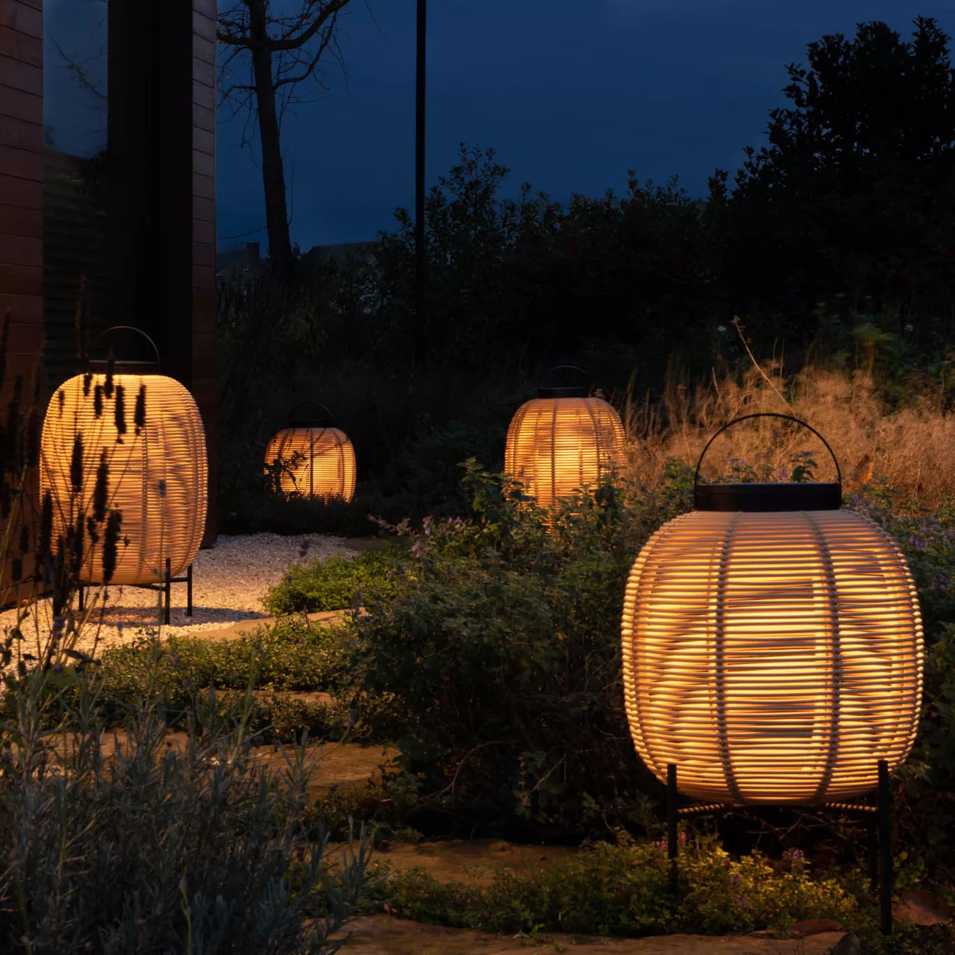 Eine solarbetriebene Laterne, die Ihren Außenbereich zum Leuchten bringt. Der gewebte Korb erzeugt ein atemberaubendes Schattenspiel, während der Aluminiumfuß dem Ganzen einen industriellen Touch verleiht. Verfügbar in zwei Größen.