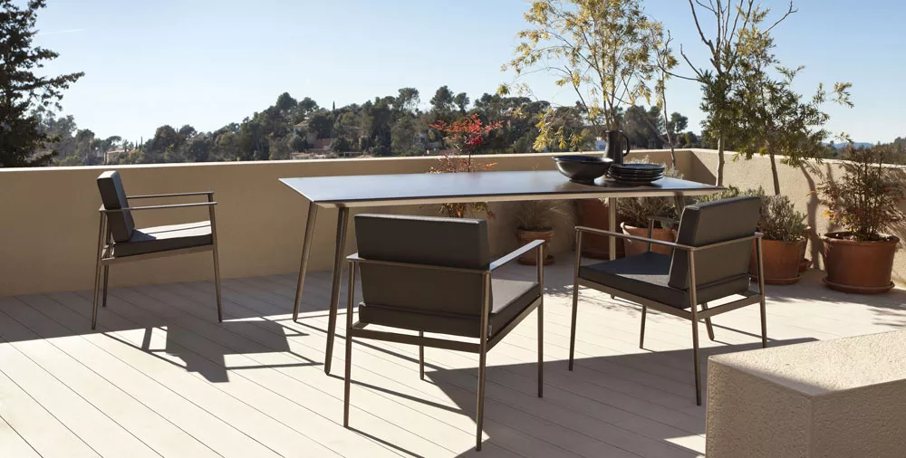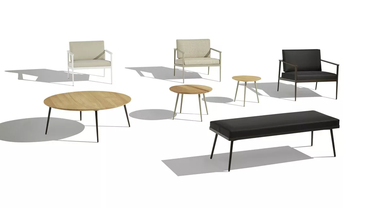 Sofas, armchairs, dining and low table collection, manufactured with an extruded aluminium structure, conified legs and final finish made with polyester powder coating.
