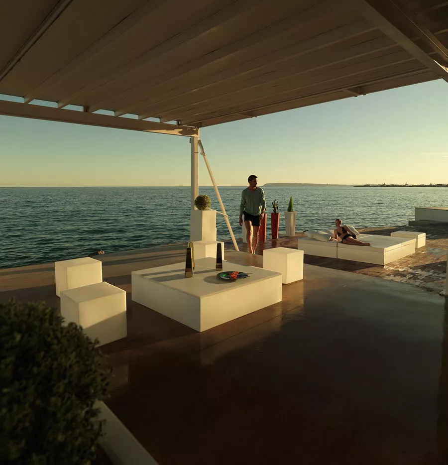 Vondom Jut Chill Lounge Hocker 120 cmDie Jut Kollektion von Vondom, entworfen von Studio Vondom, repräsentiert eine perfekte Symbiose aus modernem Design und Funktionalität. Diese vielseitige Möbelserie ist ideal für den Einsatz sowohl im Freien als auch in avantgardistischen Innenräumen und umfasst eine breite Palette an Möbelstücken, darunter Liegen, Sofas, Sessel, Stühle, Tische in verschiedenen Größen, ausziehbare Tische, Hocker und Hochtische. Maße (B × T × H) 120 × 120 × 40 cm Eigenschaften der Beleuchtungsvarianten: LED-RGB mit Akku: - Vielfarbige RGB-LEDs, 3 Weißtöne und 9 Farben (dunkelblau, hellblau, dunkelgrün, hellgrün, lila, flieder, rot, orange, gelb)- Farbwechsel durch Fernbedienung (433,92 MHz) / Reichweite: 10-15 m- 450 - 1100 Lumen Max. (je nach Modell)- 16 - 72 W Max. (je nach Modell)- inkl. Li-Ion-Batterie 5,2 V 19 Ah (Ladedauer: 4 Stunden, Betriebsdauer 5-6 Stunden, 500 Ladezyklen)- 19 Ah (je nach Verfügbarkeit) 12 V / 5-6 Stunden Autonomie/ Ladezeit 4 Stunden- 500 Zyklen / IN: 100-240 V AC / 50-60 Hz- Energieeffiziensklasse: A- Schutzklasse: IP65 / für feuchte Bereiche geeignet. RGB-LED mit WiFi (DMX - mit/ohne Akku): DMX ist ein digitales Steuerungsprotokoll, das in der Bühnen- und Veranstaltungstechnik zur Steuerung von der Lichttechnik eingesetzt wird. Es ermöglicht das Steuern einer oder mehrerer Leuchten über eine Steuereinheit. Für die Steuerung über WiFi ist ein Transmitter notwendig, der nicht im Lieferumfang enthalten ist. Sie haben die Möglichkeit zwischen zwei verschiedenen Transmittern zu wählen: Home WIFI DMX: Access Point über den Sie alle VONDOM Produkte mit Ihren IOS oder Android Gerät steuern können. Professional XLR DMX: XRL mit dem Sie alle VONDOM Produkte über ein Mischpult oder Computer steuern können. Sie benötigen nur einen Transmitter für die Steuerung Ihrer gesamten VONDOM Möbel, Pflanzgefäße und Leuchten.