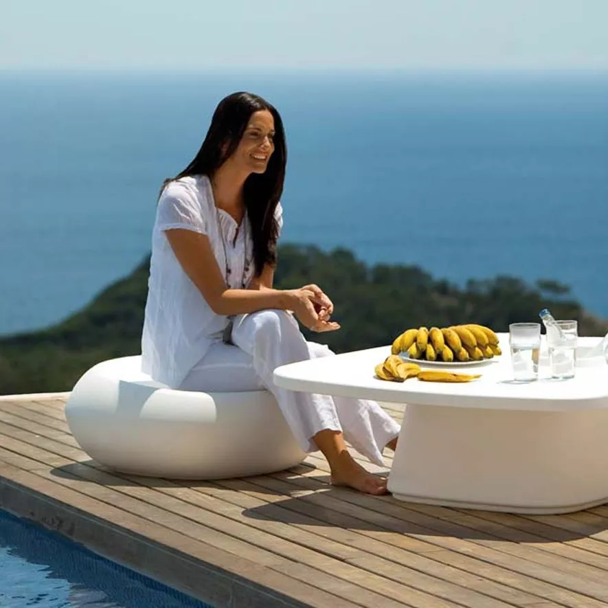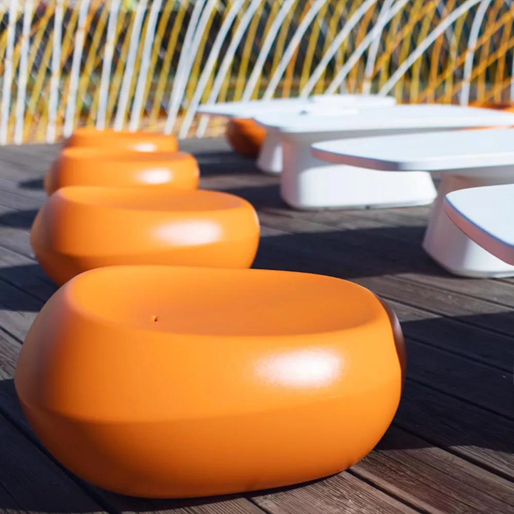 Die aus Polyethylenharz im Rotationsschmelzverfahren hergestellten Möbel sind strapazierfähig, pflegeleicht und vollständig recycelbar. Eine breite Farbpalette und verschiedene Beleuchtungsmöglichkeiten ermöglichen eine individuelle Gestaltung des Außenbereichs.