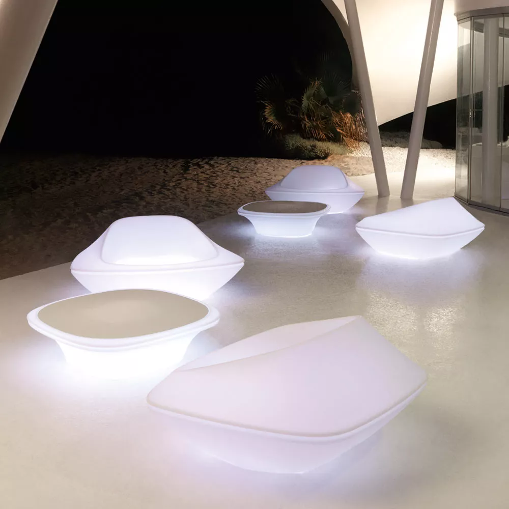 Vondom UFO Gartentisch • Outdoor EsstischDer UFO Gartentisch von Vondom: Die beleuchtete Lounge-Kollektion UFO ist immer ein Blickfang. Diese originellen Gartenmöbel zeichnen sich durch abgerundete Elemente und fließende, ausdrucksstarke Formen aus. Der Designer Ito Morabito, besser bekannt als Ora-Ito, hat für diese Kollektion ein kreatives Konzept entwickelt, das sich von der üblichen Geometrie entfernt und ein neues Gleichgewicht zwischen Natur und Technik schafft. Das geschwungene Design mit seinen eleganten Formen, das aus Polyethylen im Rotationsverfahren hergestellt wird und zu 100 % recycelbar ist, macht den UFO Gartentisch zu einem Blickfang in jeder Umgebung. Der UFO Gartentisch eignet sich sowohl für den Innen- als auch für den Außenbereich und ist in verschiedenen Ausführungen erhältlich. Diese außergewöhnlichen Gartenmöbel sind UV-beständig und nach der UV8-Norm getestet, so dass sie auch bei intensiver Sonneneinstrahlung ihre Qualität behalten. Bei Bedarf lassen sich alle Möbel dieser Kollektion schnell und einfach mit einem Hochdruckreiniger säubern. AUSFÜHRUNGEN Standard Verschiedene Farben, die Beleuchtung ist nicht integriert, die Oberfläche ist rau. Hochglanz Verschiedene Farben, hochglänzend lackiert die Beleuchtung ist nicht möglich, weil der Lack blickdicht ist. Eis / Energiesparlampe LLUM Kunststoff (Eisweiß) halbtransparent • Energiesparleuchte E27 • Schutzklasse IP65, 3m Kabel Eis / LED RGB Kunststoff (Eisweiß) halbtransparent • LED Leuchte, 7 Farben • Schutzklasse IP65 Eis / LED RGB DMX Kunststoff (Eisweiß) halbtransparent • LED Leuchte mit Steuerung über Tablet, Computer und Smartphone • Schutzklasse IP65 Eis / LED RGB BATERIA Kunststoff (Eisweiß) halbtransparent • LED Leuchte, Akkubetrieben (5-6 Stunden), 5 Farben • Schutzklasse IPX8 Maße (B × T × H) 198 × 104 × 72 cm