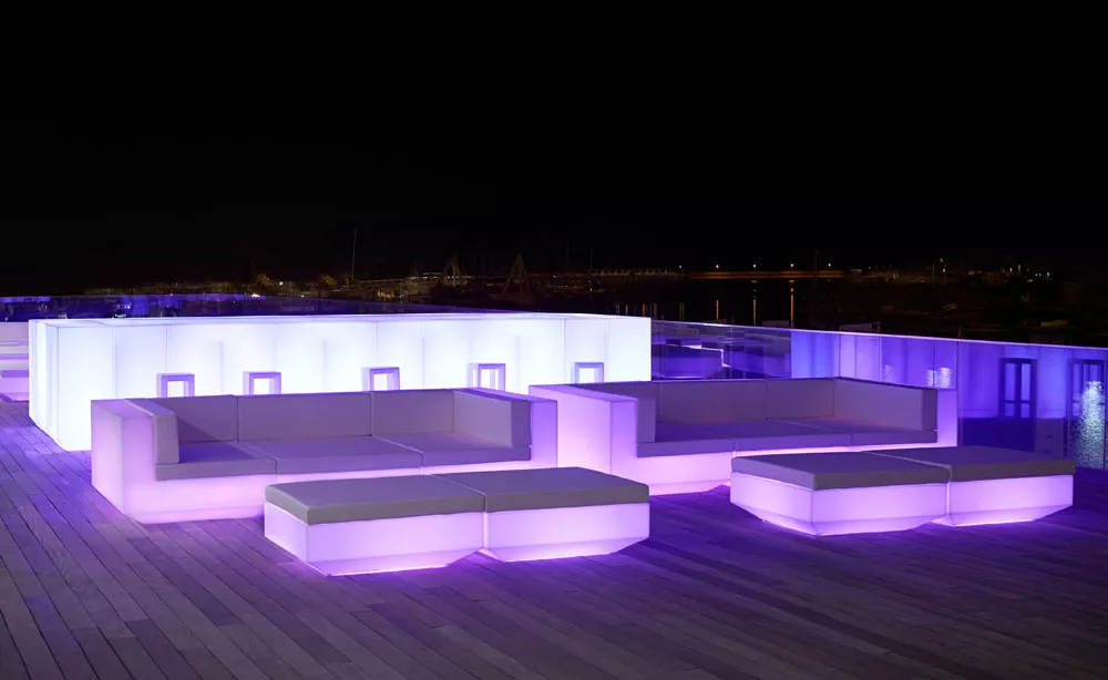 Die flachen Volumen der VELA Möbel scheinen wenige Zentimeter über dem Boden zu schweben und verwandeln sich bei Beleuchtung in lichtdurchflutete Architekturen. Das aus linearem Polyethylen im Rotationsgussverfahren hergestellte Material ist zu 100% recycelbar und hält extremen klimatischen Bedingungen von -60°C bis 80°C stand. Außerdem ist es UV-beständig und verleiht den Möbeln eine bemerkenswerte Leichtigkeit.