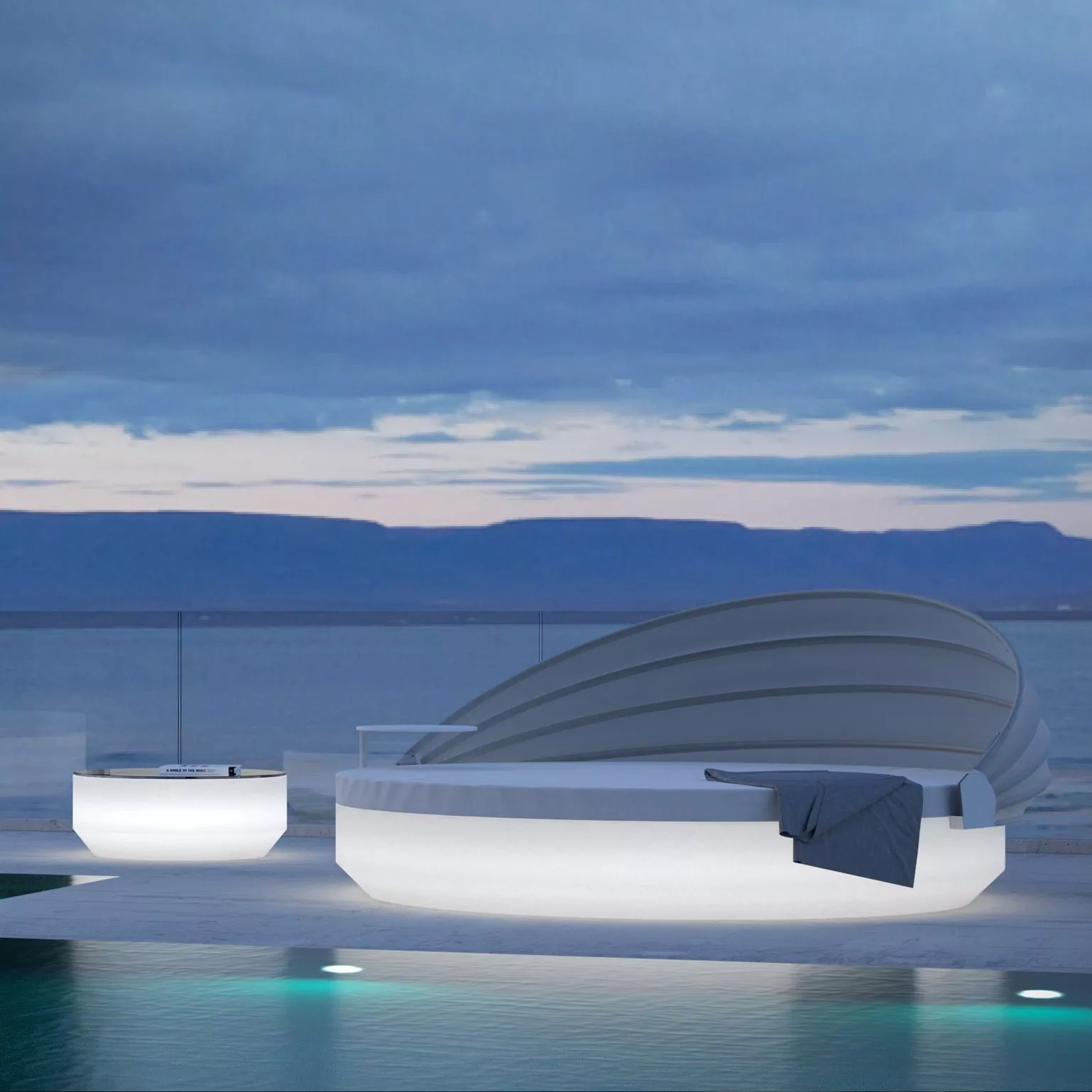 Die flachen Volumen der VELA Möbel scheinen wenige Zentimeter über dem Boden zu schweben und verwandeln sich bei Beleuchtung in lichtdurchflutete Architekturen. Das aus linearem Polyethylen im Rotationsgussverfahren hergestellte Material ist zu 100% recycelbar und hält extremen klimatischen Bedingungen von -60°C bis 80°C stand. Außerdem ist es UV-beständig und verleiht den Möbeln eine bemerkenswerte Leichtigkeit.