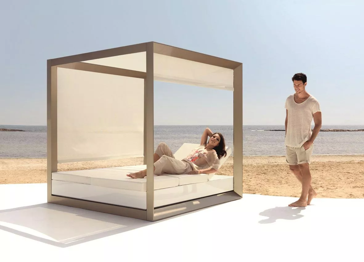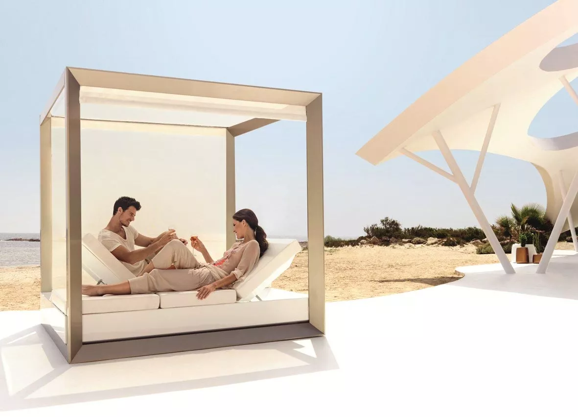 Die flachen Volumen der VELA Möbel scheinen wenige Zentimeter über dem Boden zu schweben und verwandeln sich bei Beleuchtung in lichtdurchflutete Architekturen. Das aus linearem Polyethylen im Rotationsgussverfahren hergestellte Material ist zu 100% recycelbar und hält extremen klimatischen Bedingungen von -60°C bis 80°C stand. Außerdem ist es UV-beständig und verleiht den Möbeln eine bemerkenswerte Leichtigkeit.