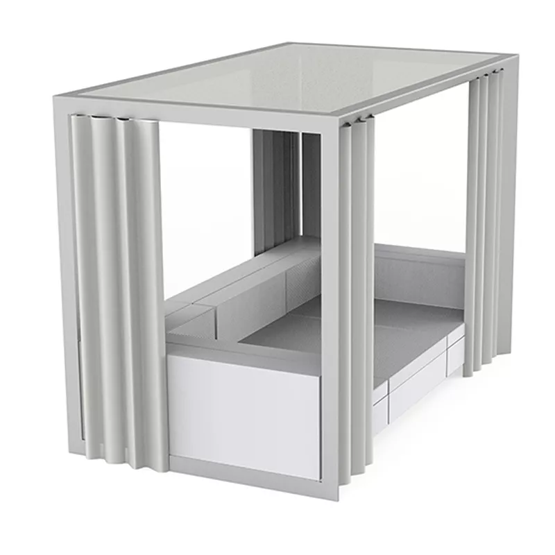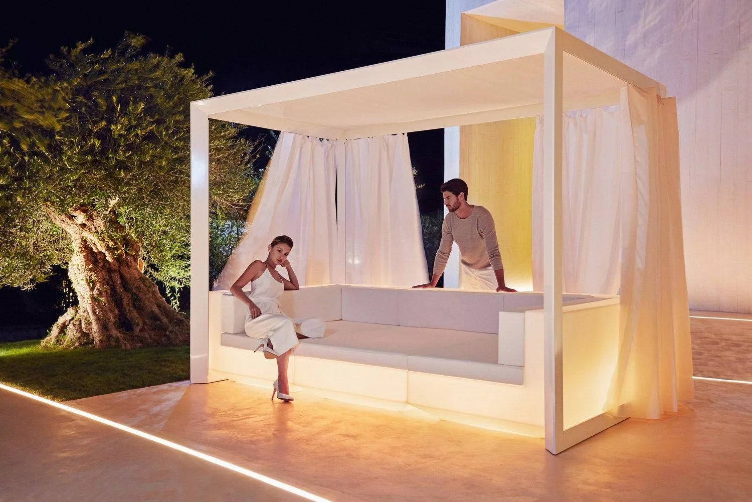 Diese umfangreiche Kollektion von Gartenmöbeln und Pflanzgefäßen vereint den Komfort und die Qualität der Inneneinrichtung, ohne ihre ursprünglichen Eigenschaften zu verlieren. VELA ist ein modulares System mit einer prismatischen Elementargeometrie und einzigartigen, ausgewogenen Proportionen. Die Elemente lassen sich untereinander kombinieren werden, um sich perfekt in jeden Raum zu integrieren. Ihre präzisen Formen schaffen die Illusion, einige Zentimeter über dem Boden zu schweben, und wenn sie beleuchtet sind, verwandeln sie sich in schwebende architektonische Strukturen.
