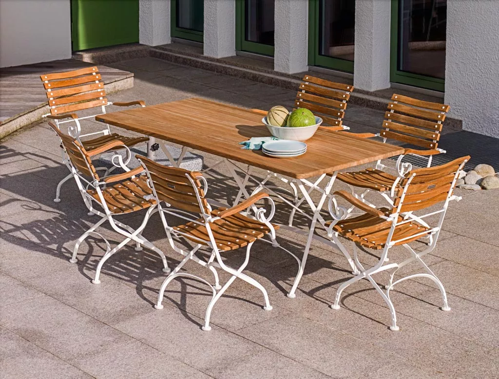 Das Classic Programm von Weishäupl ist das Ergebnis einer Entwicklung über viele Jahre hinweg. Die zeitlose Eleganz ist nie im Stil, sondern ausschließlich in der Fertigung Zeitströmungen unterworfen. Die Werkstoffe sind hochwertiger, die Technik moderner geworden. Die Harmonie der Gegensätze ist es, welche den Charme des Classic-Programms ausmacht. Die Gestelle werden aus hochwertigem, verzinktem Bandstahl gefertigt und anschließend pulverbeschichtet. Zudem werden alle Gelenke mit Zinkbuchsen ausgestattet. Nylonbodengleiter bieten den Gestellen weiteren Schutz. Die Belattung besteht aus Teak massiv und wird mittels Edelstahl-Schoßschrauben und selbst sichernden Edelstahl-Muttern mit den Gestellen verschraubt.