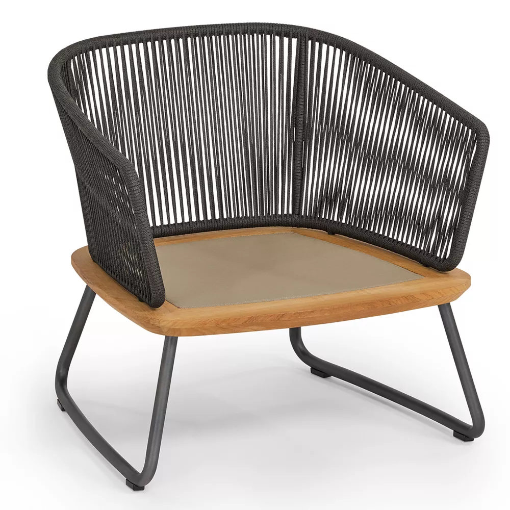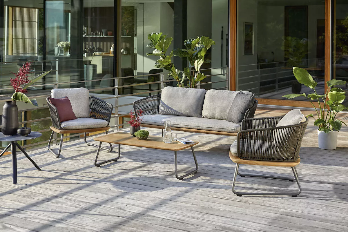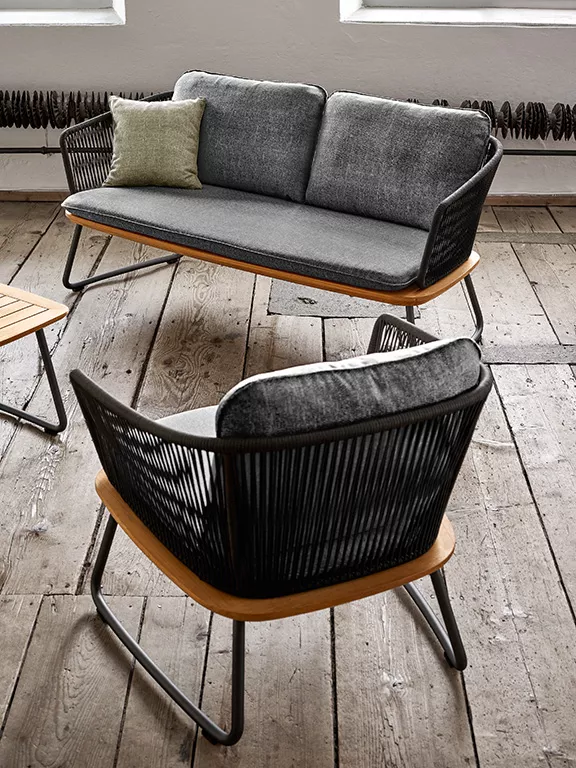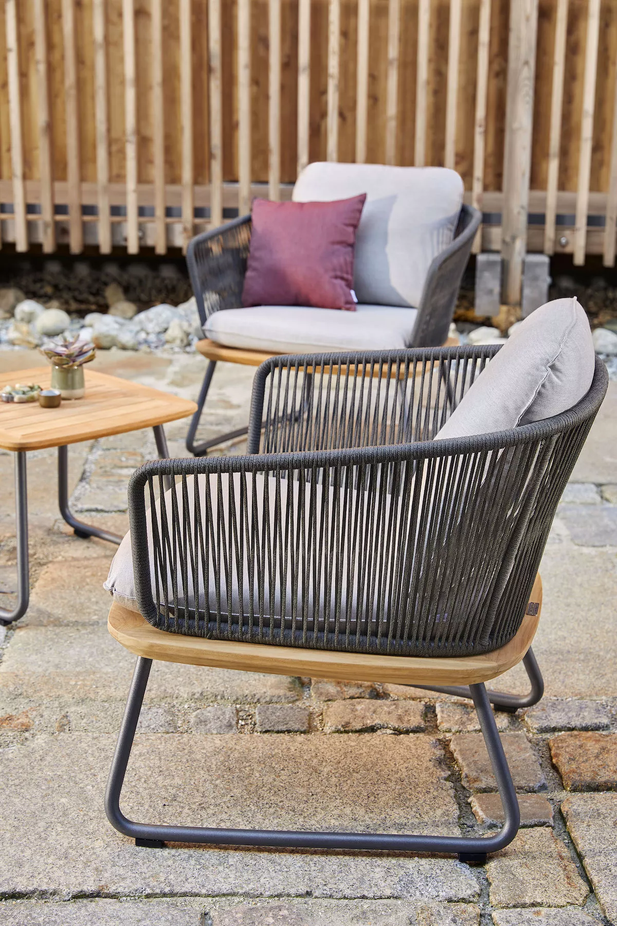 Das schlichte Design der Denia-Kollektion, lässt die Outdoormöbel überall gut aussehen - Sessel und Sofa machen sowohl auf der Terrasse, im Wellnessbereich, auf dem Balkon oder vor dem Kamin eine gute Figur. Das Gestell ist aus Aluminium und Teakholz gefertigt, die Lehnen mit hochwertigen Textilkordeln bespannt.