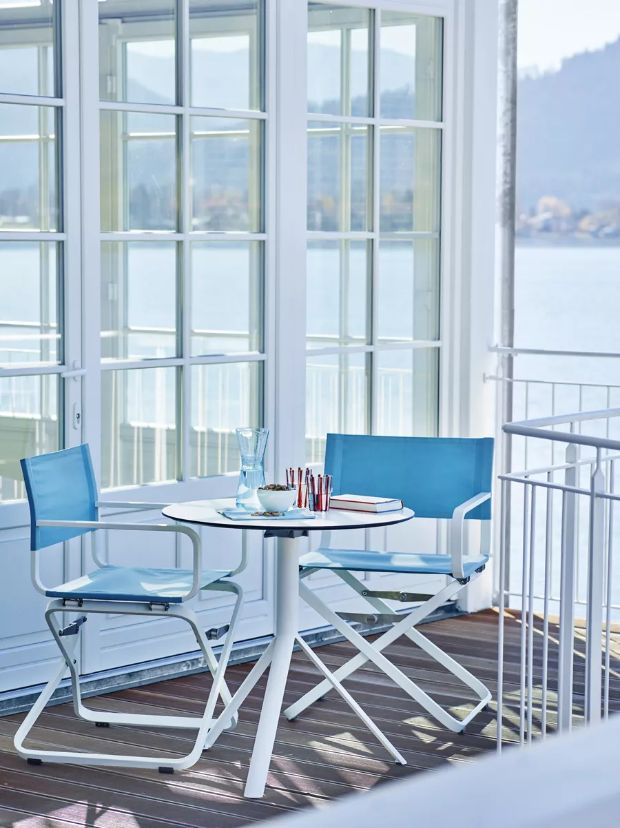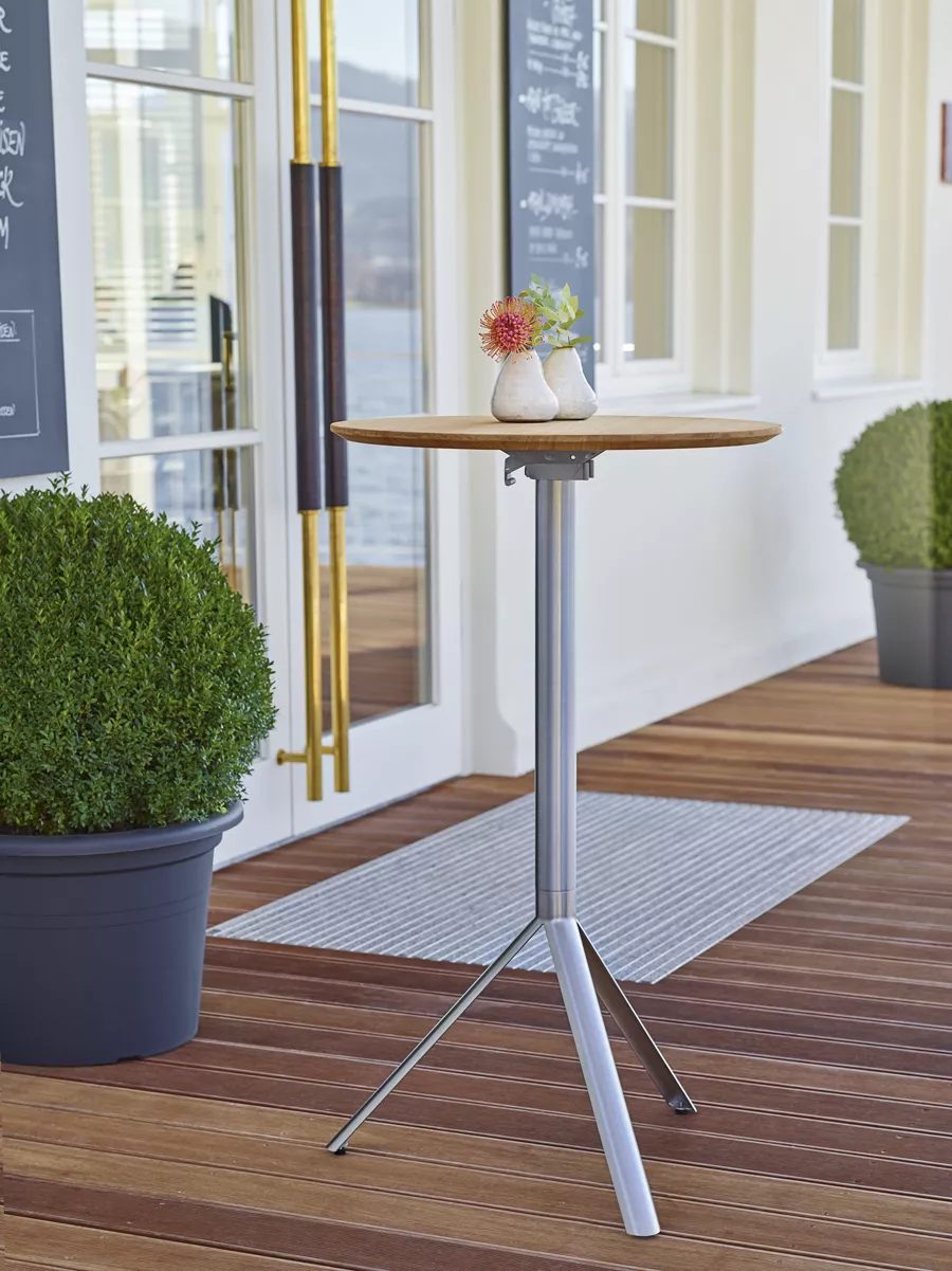 Drei Beine, drei mögliche Tischhöhen, drei unterschiedlich große Tischplatten – eindeutig TRIO, eine sehr universelle und vielseitig einsetzbare Tischlösung. Die Gestelle dieser wetterfesten Tische bestehen aus geschliffenem Edelstahlrohr sowie gelaserten und ausgestellten Tischbeinen mit Niveauregulierung. Neben der geschliffenen Oberfläche sind auch eine weiße oder eine graumetallic beschichtete Version möglich. Je nach Bedarf sind diese Tische verwendbar als Beistelltisch, Bistrotisch und Stehtisch. Die Tischplatten aus HPL oder massivem Teak sind in den Größen Ø 60, 70 cm und 60 x 60 sowie 70 x 70 cm lieferbar. Bistro- und Tresentisch sind mit einem Klappmechanismus ausgestattet.